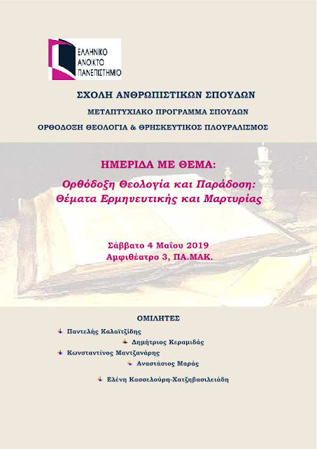 (ΕΑΠ) διοργανώνει Επιστημονική Ημερίδα με θέμα: «Ορθόδοξη Θεολογία και Παράδοση: Θέματα Ερμηνευτικής και Μαρτυρίας». Η
